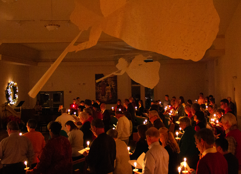 For many years, we fly our Angels artwork above the pews in the Sanctuary in December and January (and sometimes longer). It has become a very-welcoming and heart-warming tradition during the Christmas season.